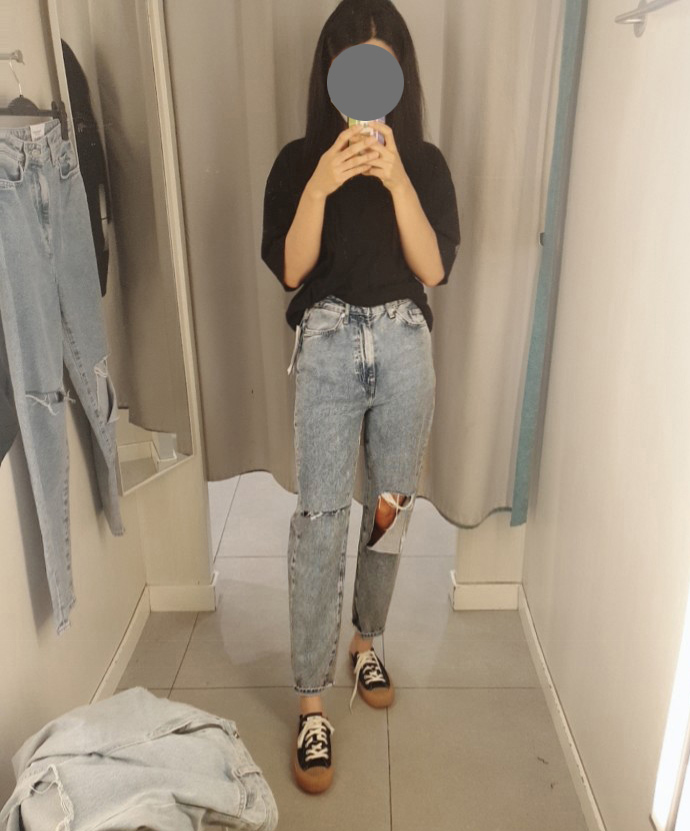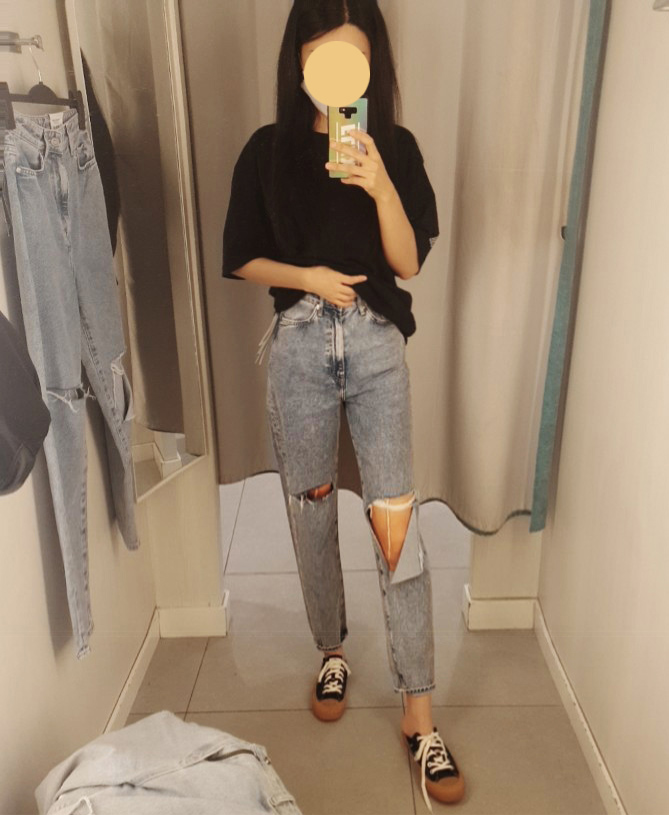 피팅룸에서 입어보고 찍은사진. 청바지가 일단 매우 편했고 워싱도 그다지 부담스럽지 않고 찢어진 컷팅도 맘에 든다. 집에 갖고있는 청바지 대부분이 아니, 그냥 전부 다 통바지거나 찢어진 청바지인데 불구하고 언제나 찢청만 보면 구매욕구가 타오르는 편.. 안찢어진 청바지가 하나두 없을 정돈데 취향이 너무 확고하다보니ㅠㅠ 안찢어진 멀쩡한 바지가 하나두 없다. 무튼 청바지 택엔 LOOSE라는 단어가 적혀있지만 그다지 루즈한 느낌은 별로 없고 베이직한 일자핏으로 깔끔하게 떨어지는 청바지.
